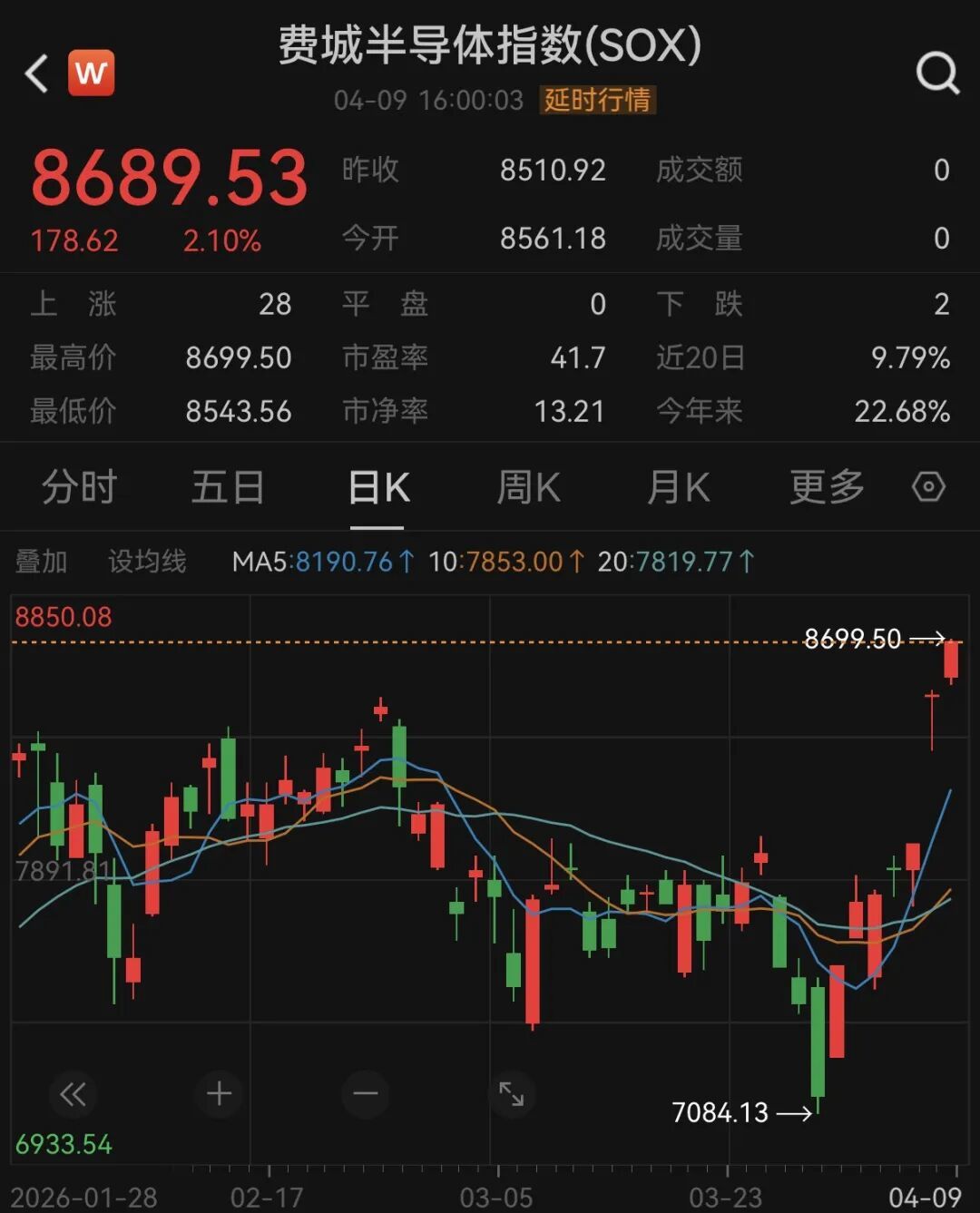 当地时间4月9日,美股三大指数全线上扬。Wind数据显示,道琼斯工业平均指数上涨0.58%,报48185.80点;标普500指数上涨0.62%,报6824.66点;纳斯达克综合指数上涨0.83%,报22822.42点。其中,标普500指数与纳指双双连续7个交易日实现上涨,道指连续7个交易日中有6个交易日实现上涨,显示出市场情绪的持续修复。