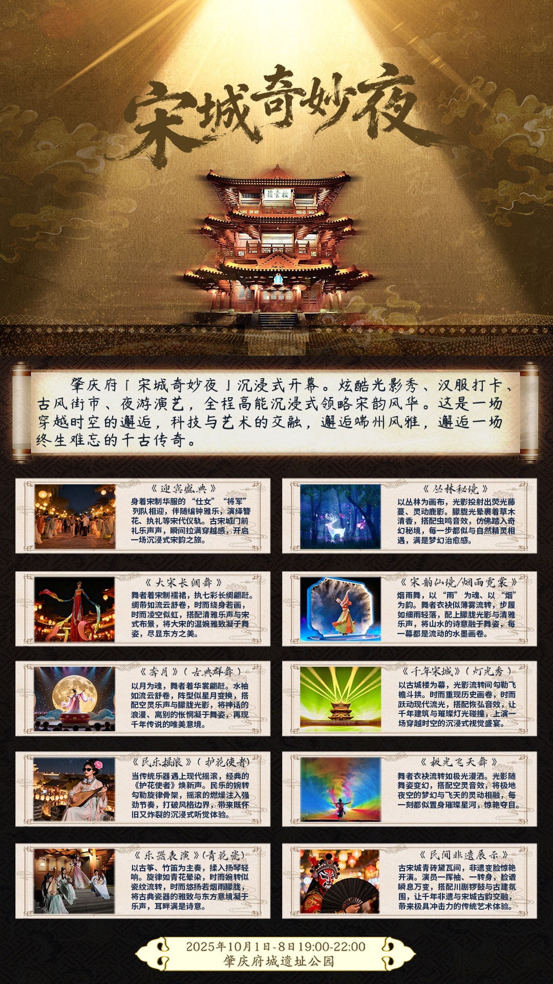 当夜幕降临,肇庆宋城墙的青砖在灯光下泛起千年光泽,披云楼的飞檐挑起星月,一场跨越时空的沉浸式夜游盛宴在此拉开帷幕。10月1日至8日,肇庆首个沉浸式实景游园夜游演出《肇庆宋城奇妙夜》将在宋城骑楼街、肇庆古城墙及周边历史街区震撼上演,以科技赋能文化,用创新演绎历史,为市民游客打造一场“可触摸、可互动、可穿越”的文旅新体验。